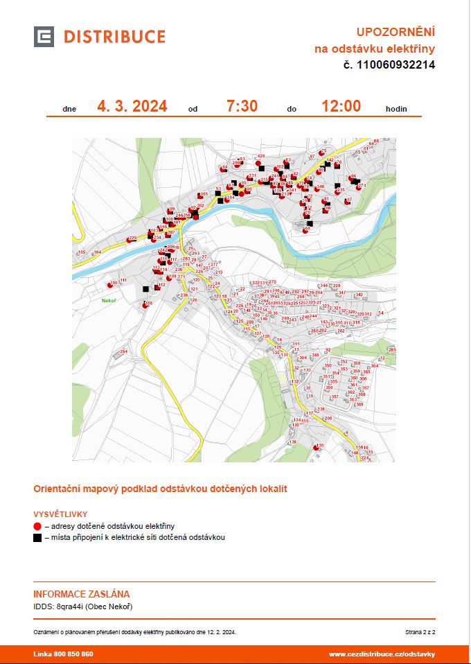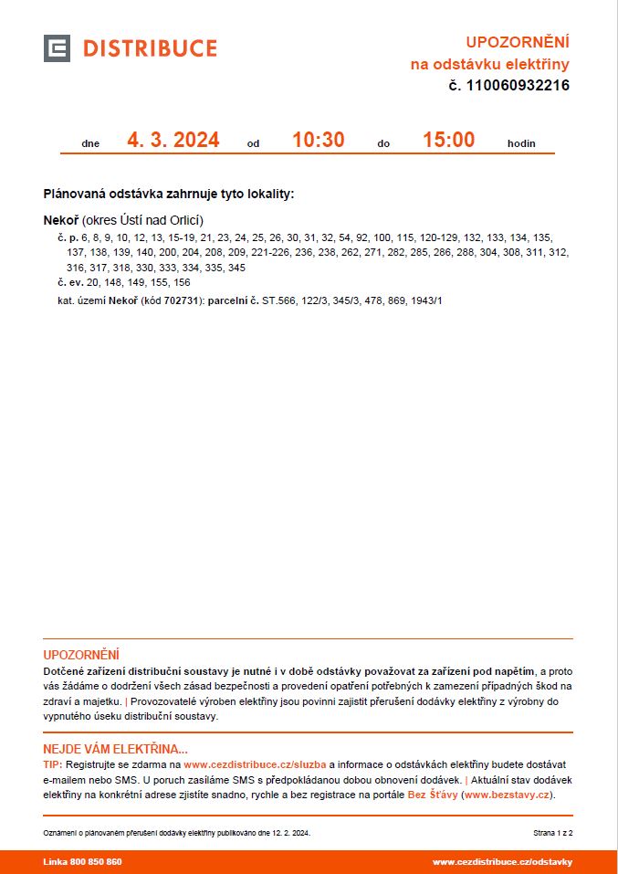 ČEZ Distribuce, a.s. oznamuje přerušení dodávky elektrické energie, které proběhnou ve dnech 22. 2. a 4. 3. Upozorňujeme, že dne 4. 3. dojde k odstávce ve dvou lokalitách. První se týká místní části obce Vejrov (7:30 až 12hodin) a druhá Nekoř (10:30 -15:00).