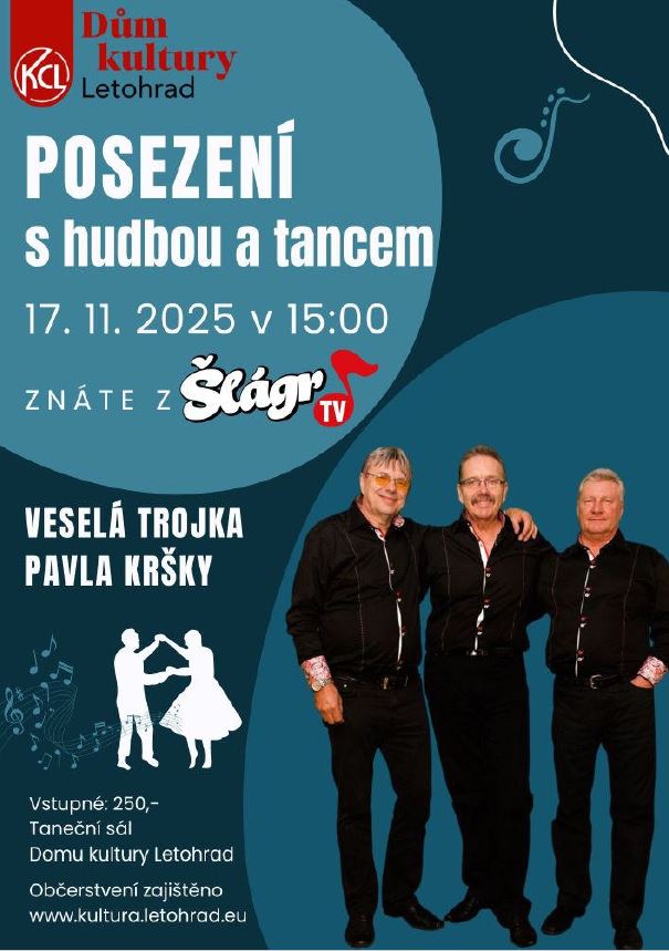 17.11. 2025 Posezení s hudbou a tancem: Veselá trojka Pavla Kršky, začátek od 15 hodin, kulturní dům Letohrad