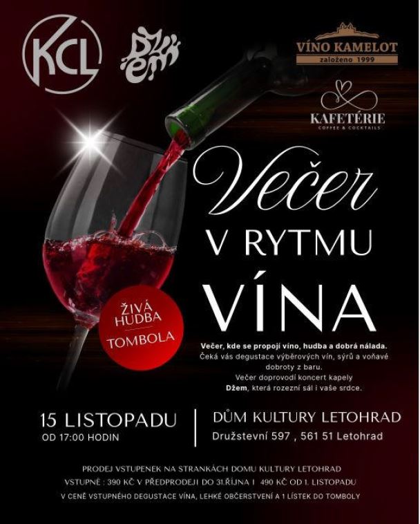 15.11. 2025 Večer v rytmu vína, začátek od 17 hodin, Kafetérie Coffee & Cocktails, kulturní dům Letohrad.