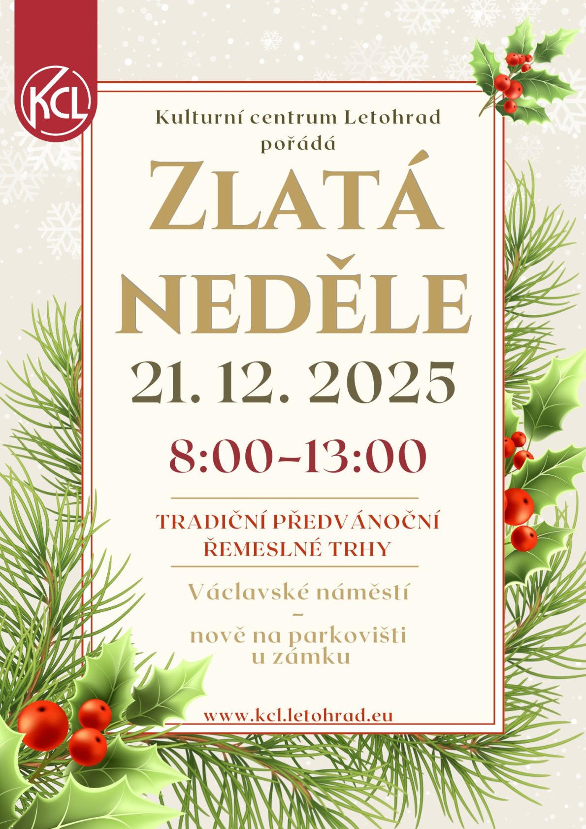 21.12. 2025 Zlatá neděle - tradiční předvánoční řemeslné trhy, začátek od 8:00 do 13:00 Václavské náměstí Letohrad.