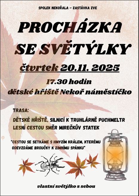 Spolek Nekořala Vás zve na procházku se světýlky, která se koná dne 20.11. 2025 od 17:30 hodin. Trasa povede z dětského hřiště u náměstíčka, silnicí k truhlárně Puchmeltr lesní cestou směr Mirečkův statek. Vlastní světýlka s sebou.