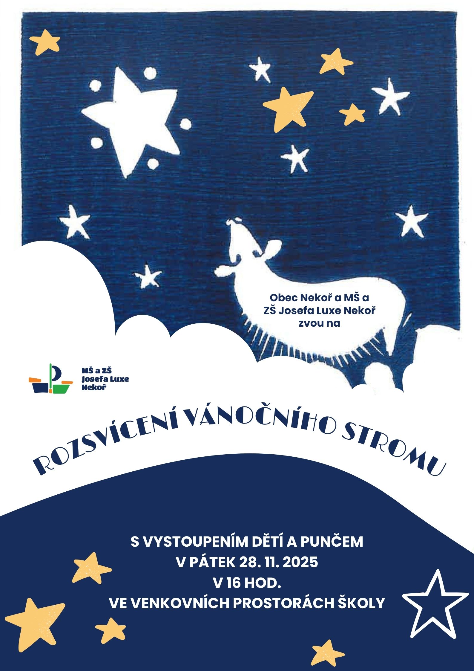 obec Nekoř a MŠ a ZŠ Josefa Luxe Nekoř Vás zvou na rozsvícení vánočního stromu. Rozsvícení se bude konat v pátek 28.11.2025 v 16 hodin ve venkovních prostorách školy. Těšit se můžete na vystoupení dětí a punč.