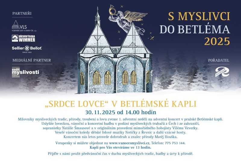 "Srdce lovce v Betlémské kapli" 30.11.2025 od 14 hodin. Milovníky mysliveckých tradic, přírody, troubení a lovu zveme 1. adventní neděli na adventní koncert v Pražské Betlémské kapli. Uslyšíte loveckou, vánoční a koncertní hudbu v podání mysliveckých trubačů z Čech i ze zahraničí, sopranistky Natálie Šmausové a v originálním provedení mimořádného hobojisty Viléma Veverky. Veselé vánoční koledy dětské lidové muziky Notičky z Řevnic a další vzácné hosty. Koncertem nás letos provede dobrodruh a znalec přírody Matěj Houška.
