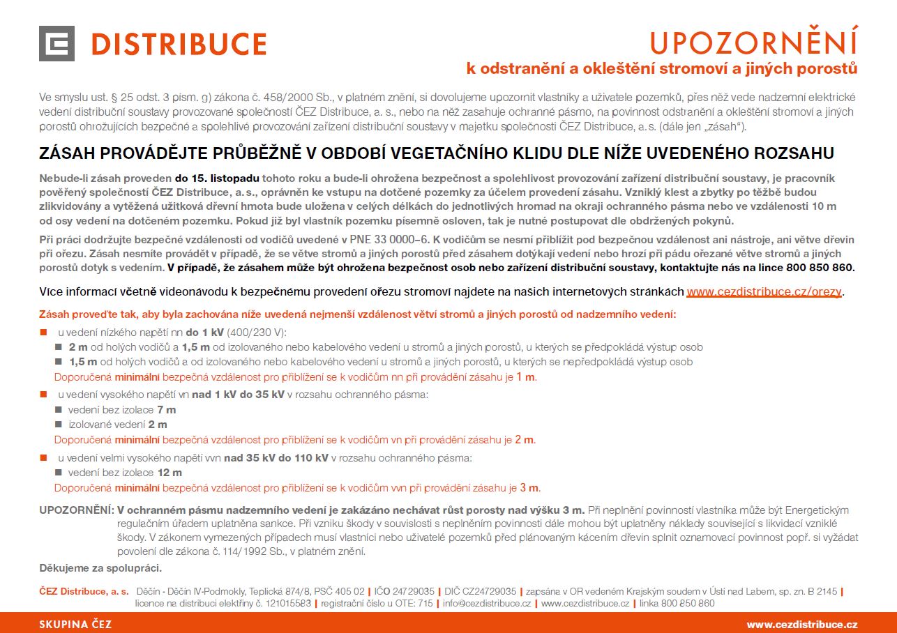 Společnost ČEZ upozorňuje vlastníky a uživatele pozemků přes něž vede nadzemní elektrické vedení distribuční soustavy, aby provedli odstranění a okleštění stromoví a jiných porostů ohrožujících bezpečné a spolehlivé provozování distribuční soustavy. Nebude-li zásah proveden do 15. listopadu 2025 a bude ohrožena bezpečnost a spolehlivost provozování distribuční soustavy, je pracovník pověřený společností ČEZ Distribuce a.s. oprávněn ke vstupu na dotčené pozemky za účelem provedení zásahu.